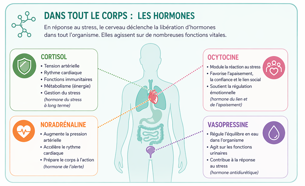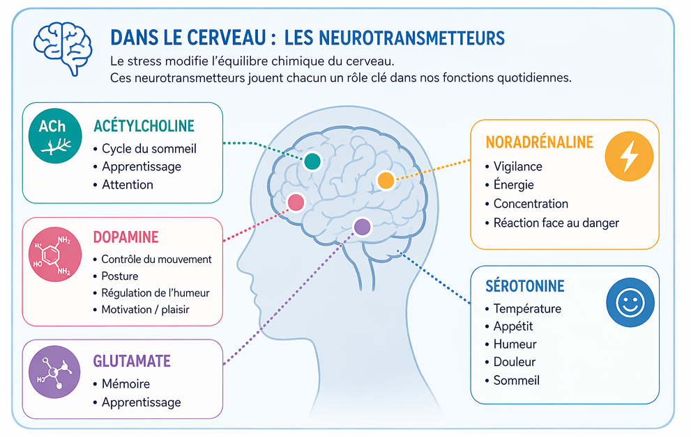 Les infographies ci-dessous présentent les différents neurotransmetteurs et hormones qui interviennent dans la réaction de stress :